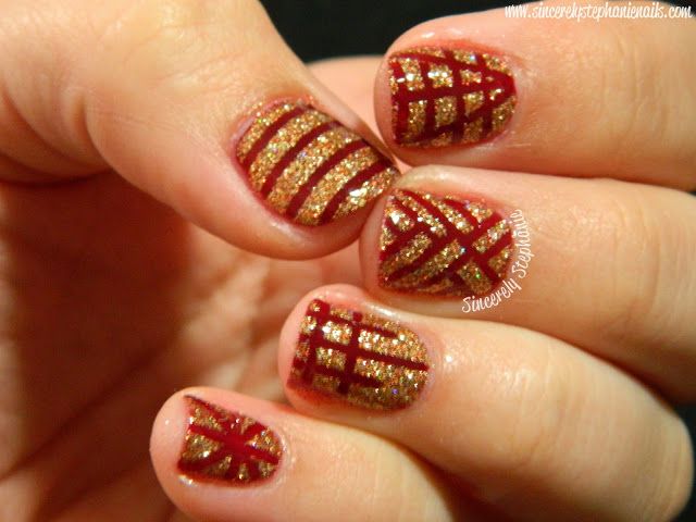 Quando la base sarà perfettamente asciutta, applica le striscioline incrociandole in base alle tue preferenze ed infine applica lo smalto color oro glitterato.